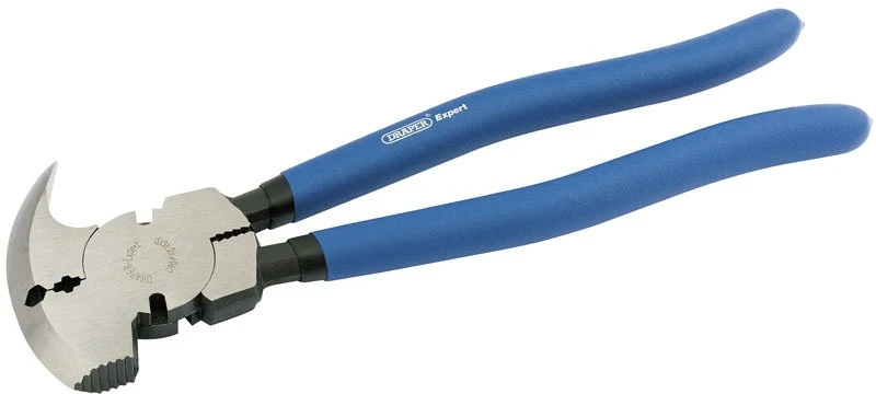 Expert Quality, manufactured from carbon steel with smoothly ground and polished head. Head incorporates a striking face; staple removing hook; pincer and clamp on top jaw; grips on inside of handles for straining and twisting wire and two shear type wire cutters. Cushion grip handles. Display packed.