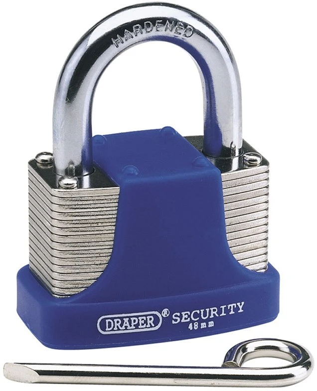 Four number combination (0001-9999), that is easily reset by use of tool supplied. Hardened steel shackle. Laminated body 48mm wide. Special cover to prevent damage to locked item. Supplied with resetting tool.