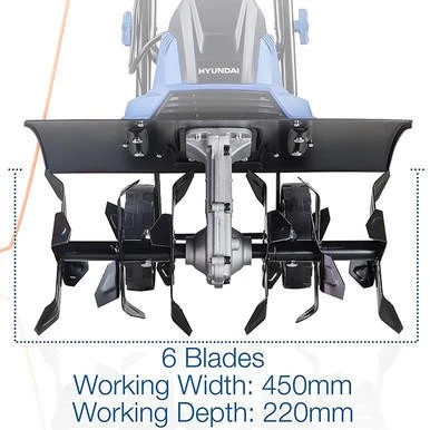 This rotovators long rear handles and fingertip controls make it easy to steer and control the tiller, making the process simple and hassle-free. It also weighs just 11kg, making it really easy to move around your garden. Budget-Friendly The HYT1500E is an affordable yet versatile electric tiller, great for a variety of gardening situations and allowing you to maintain your allotment on a budget. Electric Tiller Because this garden rototiller is electric, it saves you the hassle and additional cost of having to deal with petrol and oil. It is also incredibly low maintenance as you wont have to worry about sorting out stale fuel issues, etc; simply plug in the extra-long 10m cable and get started! 3 Year Warranty For your peace of mind, this Hyundai Electric Garden Tiller is covered by our platinum 3 year warranty. At A Glance: Perfect for vegetable gardens, smallholdings and allotments Saves you time breaking up compacted soilPowerful 1500W / 1.5kW copper motor Lightweight at just 11kg Extra-long 10m cable 400rpm tiller speed 450mm working width 220mm working depth Very easy to use Low maintenance 3 year warranty Key Features Electric garden tiller and rotavator: Perfect for vegetable gardens, smallholdings and allotments Breaks up compacted soil easily: Saves you hours of back-breaking digging Easy to use: Its 6 angled teeth cover a width of 450mm, getting the job done quickly Very low maintenance: No messy petrol or oil to deal with Peace of mind: Comes with our Hyundai 3 year warranty