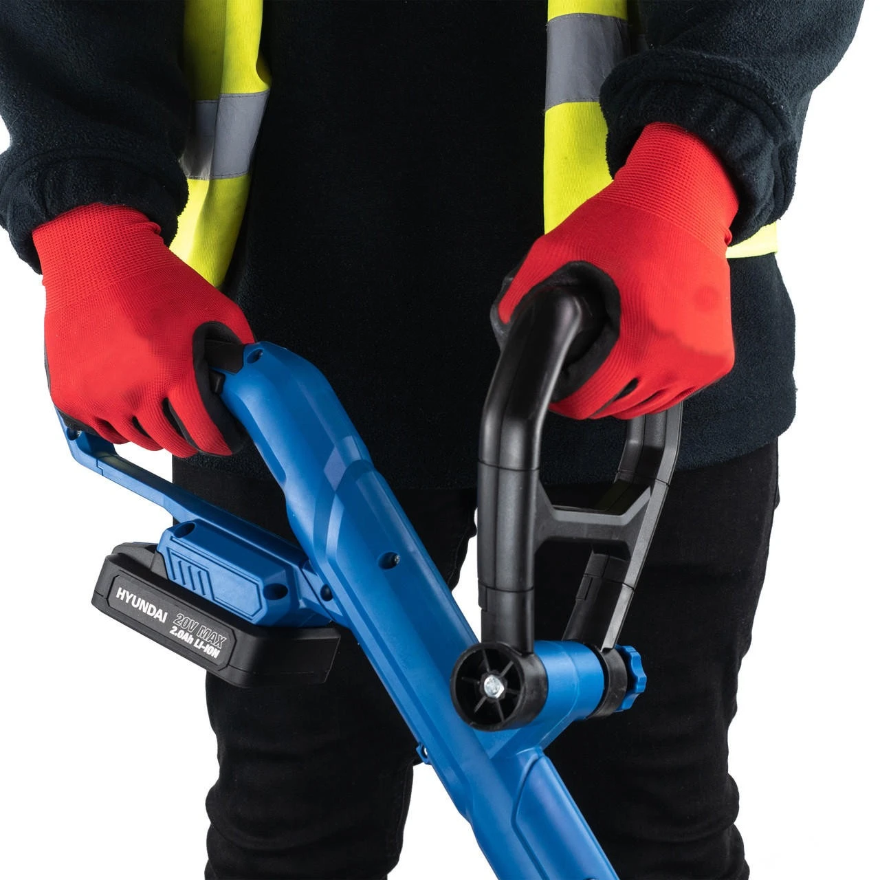 20v Battery-Powered Grass Trimmer The HY2187 is a rechargeable lithium-ion battery-powered cordless grass trimmer from Hyundai, ideal for small to medium-sized lawns (up to 2000 sq. ft.). With a charging time of just 70 minutes, the HY2187 makes maintaining your garden simple and is able to provide an average trimming time of 28 minutes (depending on the operating conditions) – plenty of time to cut your garden and get your lawn looking neat and tidy all from one charge. Hyundai Cordless Strimmer With no cables, no petrol, and no pollution, the HY2187 cordless strimmer is powered by a 20V MAX lithium-ion 2Ah battery, which means no more messy fuel or dangerous mains cables for you to have to deal with – simply charge the battery and youre ready to go. Lithium-ion technology gives you complete cordless freedom, allowing you to tackle even the most awkward or hard-to-reach areas of your garden without being limited by a power cable. 250mm Cutting Width With a cutting width of 250mm / 9.8?, this battery grass trimmer is ideal for trimming excess grass around walls, fences, flowerbeds, and pathways that your lawn mower is unable to reach to keep your garden looking neat. This cordless strimmers multi-position trimmer head can be rotated 180 degrees into an edging position for use as a lawn edger for achieving tidy edges on your lawn as well as tackling the most hard-to-reach spots in your garden for a perfect finish. Comfortable To Use The HY2187 is comfortable to use and its adjustable telescopic handle, which can be extended up to 96cm, allows you to easily adjust the length of the trimmer to suit your height for optimum comfort and minimal strain whilst in use. With its ultra-lightweight design of 2.25kg, you can use this grass trimmer without straining your arms, shoulders or back for extra comfortable grass trimming. As it’s battery-powered, this grass trimmer doesn’t carry the additional weight that petrol strimmers do, making this a great option for those looking for a strain-free, easy trimming experience. Easy To Use With no engine to service, you dont need to spend time checking oil, air filters or spark plugs, making it extremely easy to maintain – simply charge the battery and off you go! With fingertip control for effortless operation, the HY2187s motor has a very low noise output, making it less disruptive to your family and your neighbours than petrol-driven strimmers. 20v Grass Strimmer This unit includes a 20V MAX battery – which has an indicator light to show you how much battery is remaining – and a charger. Our brand new 20v range, which includes a grass trimmer, hedge trimmer, leaf blower, pole hedge trimmer, pole saw and full range of cordless 20v power tools all use the same battery so you can have multiple batteries charged and ready to go by purchasing more than one tool in the range. 3 Year Warranty For added peace of mind, our Hyundai HY2187 Grass Trimmer comes with our Hyundai 3 year platinum home-use warranty* / 1 year commercial warranty* (terms apply), with full UK parts and service to maintain your strimmer for years to come. In The Range If you require a longer battery runtime for larger lawns but still want the freedom and ease of a cordless grass trimmer, our 40v grass trimmer is available here and also has an interchangeable battery that can also be used in our 40v hedge trimmer, chainsaw, leaf blower and lawn mowers. At A Glance: Low maintenance cordless grass trimmer Ideal for small to medium-sized lawns Lightweight at just 2.25kg 20V MAX battery provides ample power to trim grass and light weeds Same battery powers entire Hyundai 20v garden machinery and power tool selection Cutting width of 250mm will get the job done quickly Battery charges in just 70 mins Easy to use Includes battery and charger 3 year Hyundai home-use warranty* (terms apply) Key Features Cordless grass trimmer: Powered by a 20V MAX lithium-ion battery 250mm trimming width: A great grass trimmer option for small / medium gardens Weighs just 2.25kg: Lightweight thanks to its durable aluminium shaft Adjustable telescopic shaft and head: Able to be used both as a strimmer and lawn edger Interchangeable battery: Power the whole Hyundai 20V MAX garden machinery and power tool range from the same battery Includes lithium-ion battery and charger: No cables, no petrol and no pollution Low maintenance and easy to use: Simply charge the battery and youre ready to start trimming Peace of mind: 3 year Hyundai home-use warranty* / 1 year commercial warranty* (terms apply)