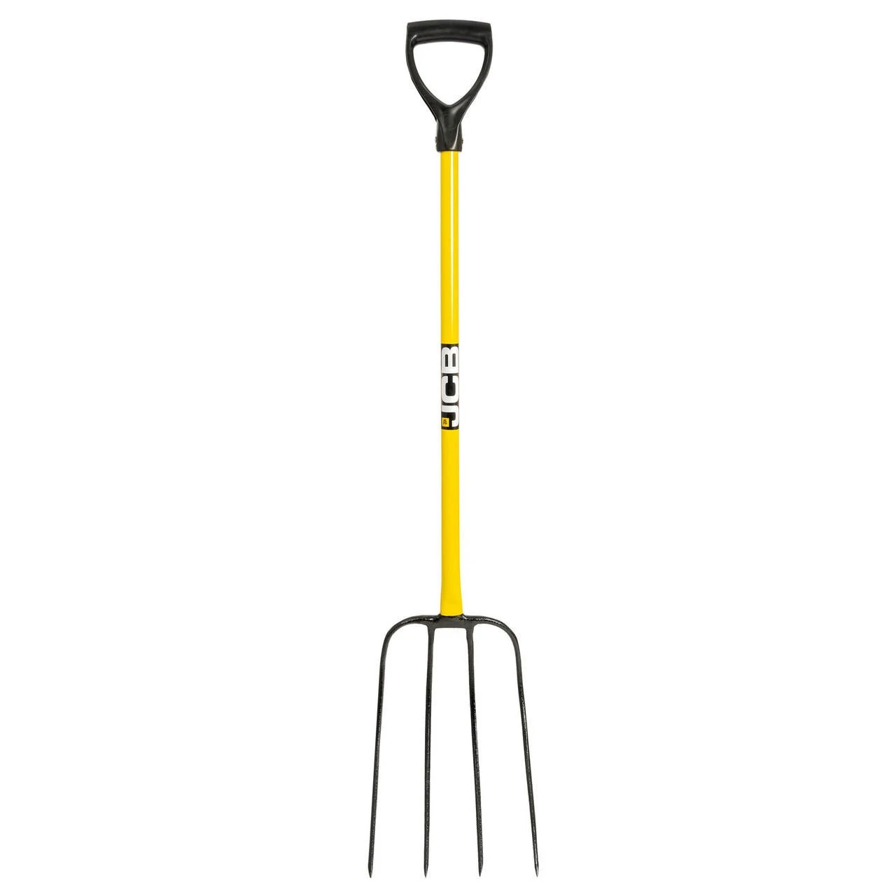 Manure Fork Made from hardened and tempered high carbon steel, the prongs are extremely strong. Its 32 tubular steel shaft is fitted with an ergonomic Poly-Pro YD handle to help with tipping and turning. Lightweight yet still well balanced and heavy-duty, our tools are made to last. We know that our products need to perform, therefore, we only certify and stamp our Professional Tools with the JCB Logo once they have individually surpassed our rigorous testing ? our guarantee to you that they will get the job done. Key Features Specifically intended for Agricultural and Equestrian use, the JCB Professional four pronged manure fork is designed to help when lifting and moving manure.