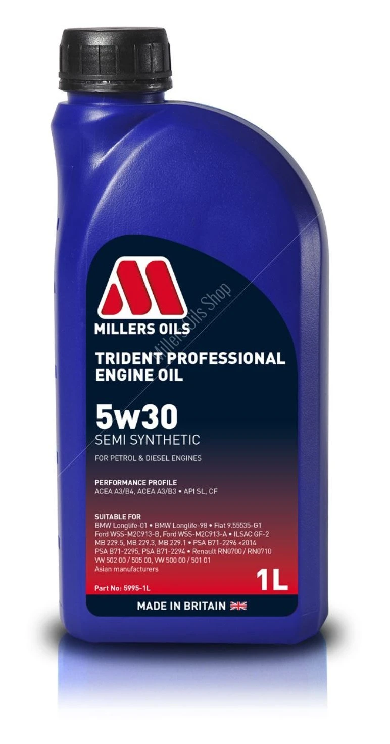 A professional, semi synthetic, full SAPS engine oil suitable for the latest engine technology. Designed to meet OEM specifications and suitable for use in both petrol and diesel engines. Millers Oils Trident Professional 5w-30 is recommended for engines requiring a 5w30 viscosity meeting the manufacturer specifications.