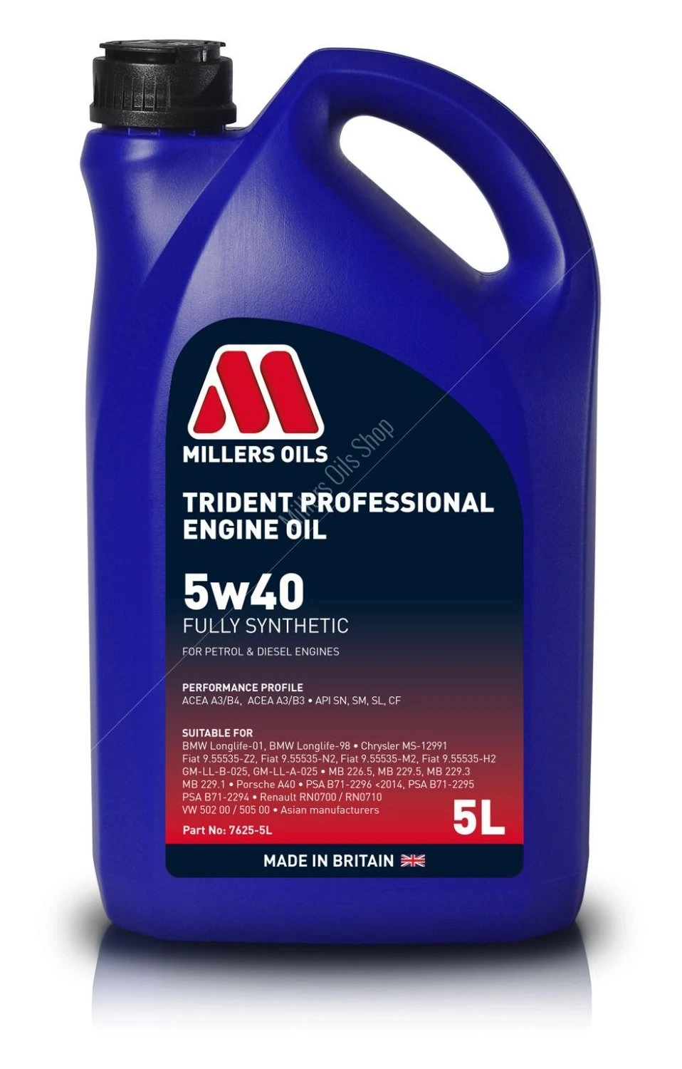 A professional, fully synthetic, full SAPS engine oil suitable for the latest engine technology. Designed to meet OEM specifications and suitable for use in both petrol and diesel engines. Millers Oils Trident Professional 5w-40 is recommended for engines requiring a 5w40 viscosity meeting the manufacturer specifications.