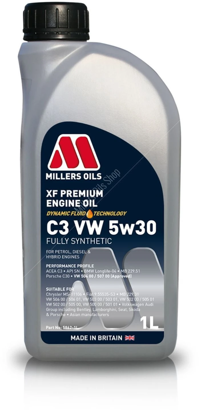 A fully synthetic, mid SAPS, premium OEM approved engine oil formulated using Millers Oils Dynamic Fluid Technology (DFT) for use in petrol, diesel and hybrid engines. Recommended for applications requiring a C3 5w30 viscosity. Designed for Volkswagen Audi Group (VAG) including Bentley, Lamborghini, Seat, Skoda and Porsche. Other coverage includes BMW and Mercedes Benz.